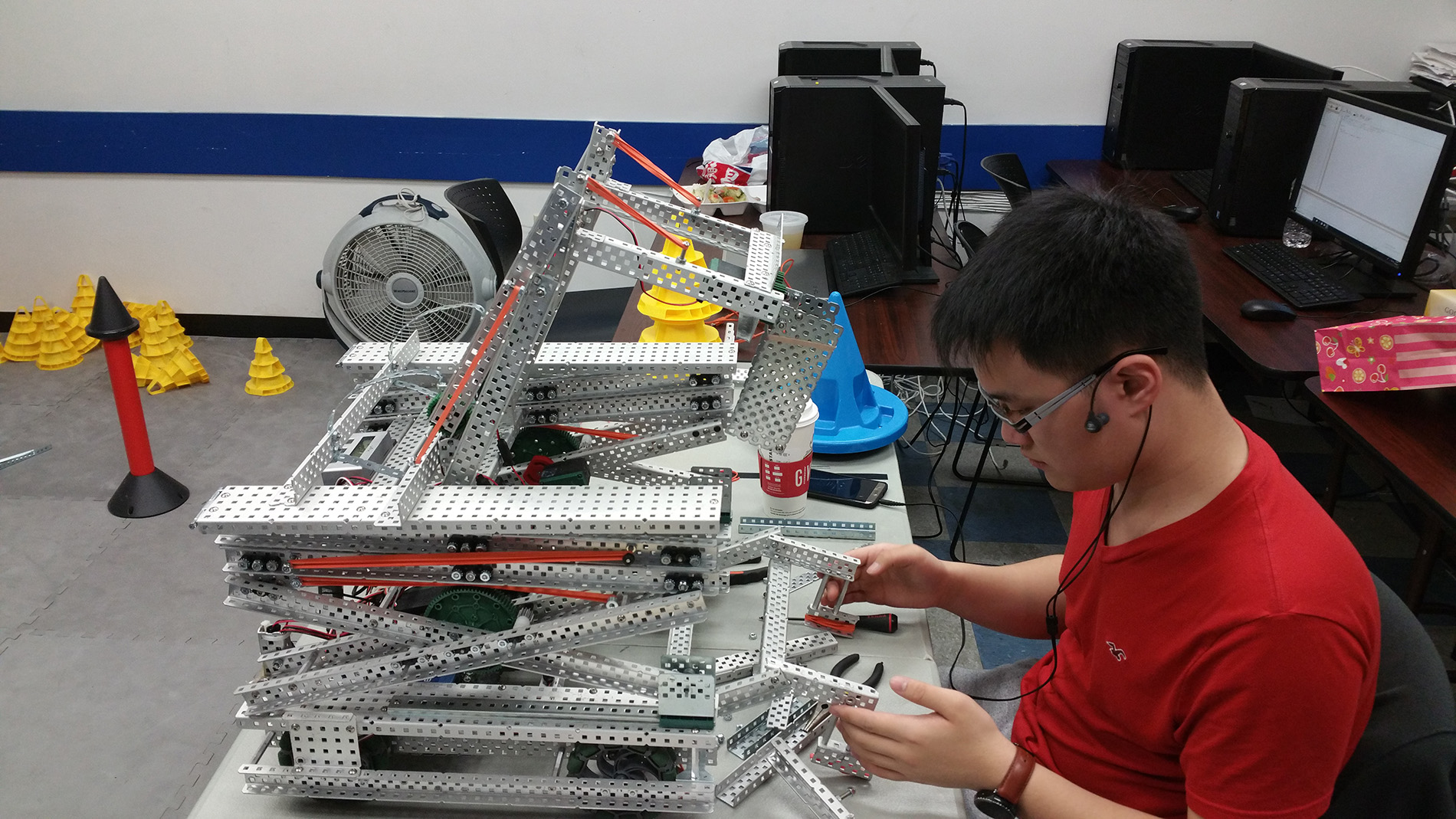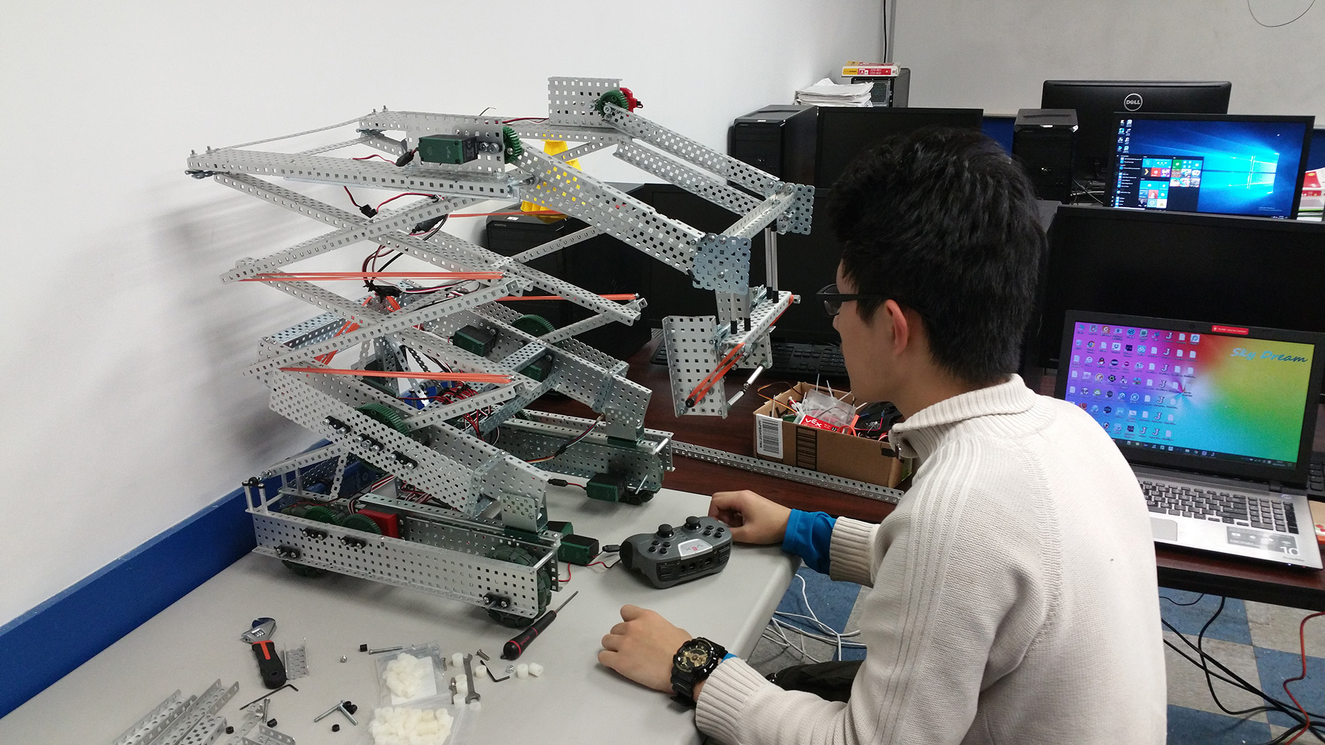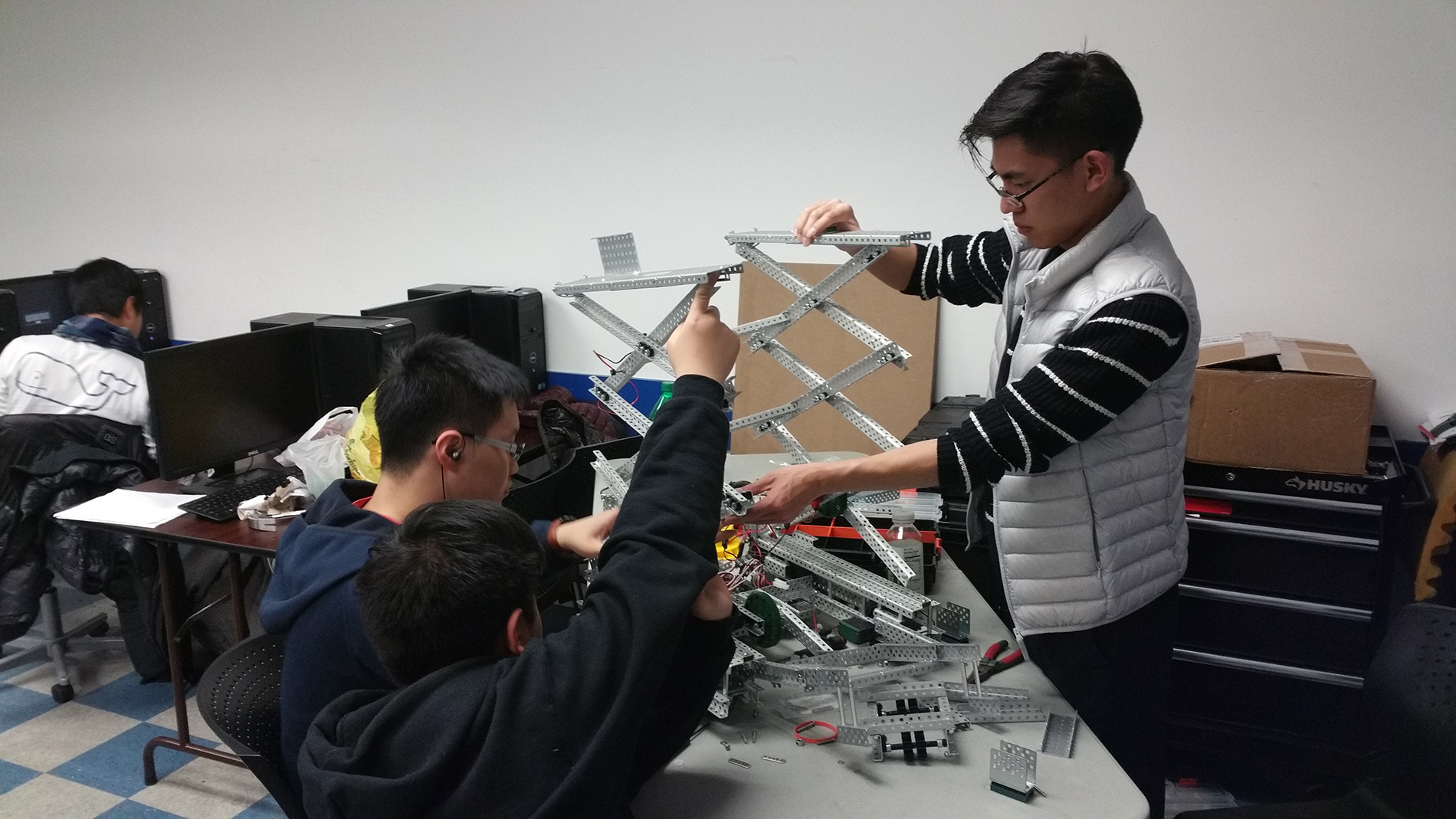 Vex competition regulates robots to be within a certain size. These changes are done at the team's dremel station where members cut parts to fit the regulated sizes
