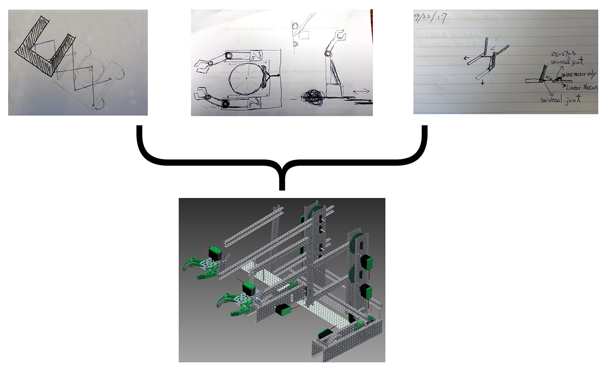 The robotics curriculum relies heavily on student creativity and imagination. First, the blueprints are drawn on paper by the team then transferred to AutoCAD (3D Drawing Program) and finally the robot building phase begins